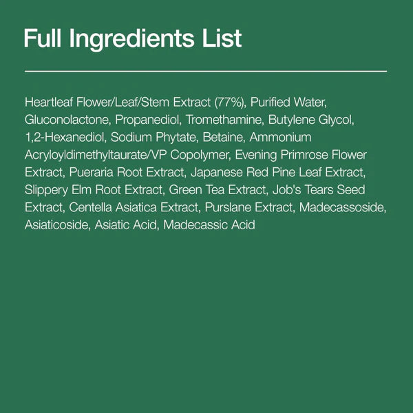 - FORMULATED WITH NATURAL INGREDIENTS Contains 77% Heartleaf Extract, Hypoallergenic and ideal for sensitive skin, this extract helps soothe irritation while providing benefits in a hydrating, non-sticky texture