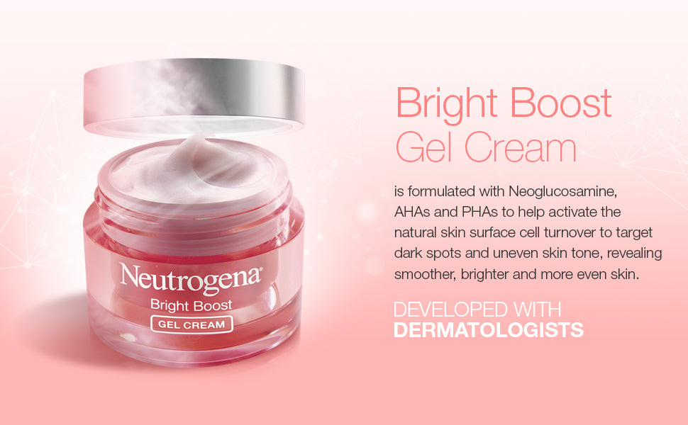 Neutrogena bright boost gel cream is a specially formulated lightweight, non-greasy gel cream that gives your skin a fresh start! It is powered with neoglucosamine, a prestige ingredient that is scientifically proven to make the skin brighter, smoother and more even. Neutrogena bright boost gel cream helps activate the skin's natural renewal process by 10x and reduces melanin production to improve the appearance of dark spots, uneven skin tone and fine lines. It also contains aha and pha to promote gentle exfoliation, getting rid of dull and tired cells. By activating the surface skin cells natural turnover, this gel cream helps to reveal a brighter, more radiant even skin tone. Neutrogena bright boost gel cream is suitable for all skin tones and all skin types.