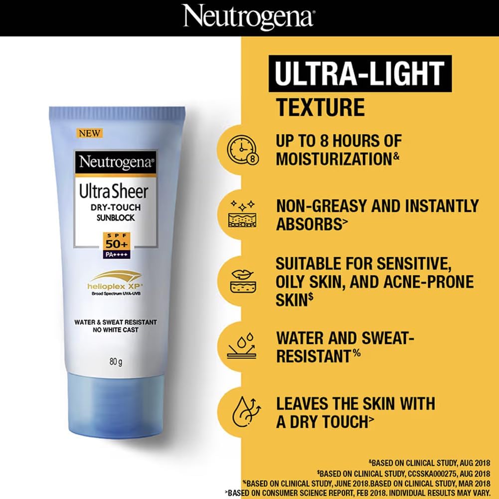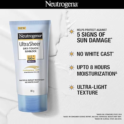 Neutrogena® Ultra Sheer Dry-Touch Sunblock SPF 50+ is a revolutionary, dermatologist-tested formula that contains helioplex technology, the latest breakthrough in UV protection. Stabilized with Helioplex, it provides superior balanced broad-spectrum protection against skin-aging UVA and burning UVB rays, and combines it with Dry Touch Technology for and ultra-light, non-shiny finish. Serious sun protection never felt this light on your skin. This lightweight sunblock has a light fresh scent and is gentle enough even for sensitive skin.